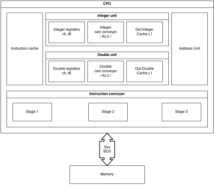 Конвейер за обработка на инструкции.Конвейерът за обработка на инструкции е от три степени. Първа степен прочита цялата инструкция, кода на инструкцията и операнда. Всяка инструкция е разположена на 2 последователни адреса. На първия адрес е кода на инструкцията, на втория е операнда. Изключение е само инструкцията с непосредствено адресиране за конвейера за числа с плаваща запетая. Тя е с дължина 3 адреса, защото числото с плаваща запетая заема 2 последователни адреса. За прочитане на една инструкция са необходими 2 цикъла на системната шина и 3 цикъла за инструкция от 3 последователни адреса. Втора степен на конвейера за обработка на инструкции е най - сложната. Тя получава цялата инструкция от 1-ва степен. Извършва четене от паметта ако е необходимо. Адресът за четене може да е абсолютен, но може да е изчислен и от адресния модул въз основа на указани индексен и базов регистър в инструкцията. Тя може да запише стойност в някой от регистрите на изчислителен или адресния модул. Може да предаде код за изчисление на някой от изчислителните модули. Да предаде адрес и стойност на 3-та степен за запис обратно в паметта. Втора степен извършва и синхронизация между всички модули с които е свързана. Трета степен на конвейера се активира само когато инструкцията е от регистър към паметта, тоест запис на резултат в паметта. Тя е най-простичка. Нейната работа е да извърши запис в паметта. Фиг. 5 Блок схема на конвейера за обработка на инструкциите