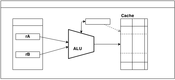 II. Как работи RCPU.RCPU съдържа целочислен модул – Integer unit, модул за обработка на числа с плаваща запетая Double unit, конвейер за обработка на инструкции – Instruction conveyer, модул за адресни изчисления – Address unit и кеш за инструкции – Instruction cache. Целочислен модул – Integer unit.Модулът за обработка на цели числа има 2 регистъра с общо предназначение rA и rB. В тях може да се пише и чете. Има аритметично – логическо устройство АЛУ, което извършва операции с цели числа. Резултатите от АЛУ постъпват направо в кеш памет от асоциативен тип. На всеки адрес (ред) от тази кеш памет има поле за данни в което се записва резултата от изчислението. Има адресно поле в което се записва изчисленият от адресния модул адрес. Има и флаг който показва валиден ли е адреса в адресното поле. Този флаг е нужен защото в някои операции като например операциите за сравнение между регистрите rA и rB адресът ще е нула. Кеш паметта е организирана и като кръгов буфер. Ако резултата от АЛУ ще се запише в адрес, който вече съществува в кеша се пише върху него. Ако адресът не съществува резултата ще се запише в следващ адрес сочен от брояч. Когато брояча се препълни се нулира сам и сочи началото на кеша. Възможни са и други стратегии за управление на кеш паметта, тази е най-простичката и засега се използва тя. Целочисленият модул е показан на фигура 3. Фиг.3 Блок схема на целочислен модул.