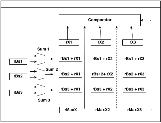 Модул за изчисления с числа с плаваща запетая – Double unitПо-точно това е модул за работа с числа с двойна дължина ( разрядност ). Модулът за работа с числа с плаваща запетая има същата организация и устройство като на целочисления модул. Разликата е, че регистрите са с двойно по-голяма ширина и данновата част на кеша е също с двойна ширина. Освен всичко това той може да извършва и някои целочислени изчисления. Бит в инструкцията посочва как да се интерпретират числата, като цели или с плаваща запетая. Например той може да извърши умножение между младшите половини на регистрите rA и rB. Ако едно двоично число го повдигнем на квадрат, то се побира в регистър с двойна дължина от неговата. Кеш за инструкцииНа адрес в кеша за инструкции има адресна част и част за данни. Също е организиран като кръгов буфер. Първа степен на конвейера за инструкции проверява съществува ли адреса който трябва да прочете в кеша. Ако не, го чете от паметта. Също така всяка прочетена инструкция от първа степен на конвейера се поставя в кеша. Начините за управление на кеш са известни, тук се ползва най-простичката. Модул за адресни изчисления.Модулът за адресни изчисления има 3 базови регистри rBs1, rBs2 I rBs3, 3 индексни регистъра rX1, rX2, rX3 и един регистър за максимална стойност rMaxX. Освен това има и матрица с размер 3 x 3 от 9 регистъра достъпни само за четене. До нея в колона са базовите регистри, а в редица са индексните. Както е показано на фигурата. Така с помощта на 3 суматора в матрицата се съдържат пълна комбинация от суми между индексен и базов регистър. При промяна стойността на един базов регистър например суматорите се превключват и изчиаляват наново цялата редица в матрицата за суми с този базов регистър и съответните индексни регистри. По същия начин ако се промени стойността на индексен регистър суматорите се превключват и се преизчисляват сумите в матрицата в неговата колонка. Това е много удобно при работа с масиви. Например при копиране от масив в масив спестяваме инструкция и време. Тази обвързаност между регистрите може да се включва и изключва. Интересно е да се изнамери и друга реорганизация на тези регистри за други видове удобни изчисления. Регистърът rMaxX се използва от инструкция която прави сравнение с него и посочен индексен регистър. Така се разбира за край на масив и цикъл от тип for се изпълнява много лесно. Друго приложение на този регистър е когато той се зареди с 0. Проверките за нула са много използвани при работа с указатели. В примерите има програма която го демонстрира. Фиг. 4 Модул за адрсни изчисления