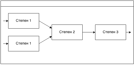 Най-голям приоритет за достъп до паметта има 3-та степен, след това е 2-ра и с най-нисък е 1-ва степен. Втора степен на конвейера има и вградена логика за разпознаване на инструкции с преход. Когато разпознае такава инструкция се активира още една паралелна степен на първа. Тя започва четене на данни от адреса за преход който се съдържа в инструкцията. Ако няма преход конвейера си продължава работа със старата 1-ва степен, при преход превключва към алтернативната и прави ресет на ненужната. Това увеличава производителността, защото при преход следващата инструкция е прочетена. Фиг. 6 Блок схема на конвейера за обработка на инструкции с 2 паралелни 1-ви степени