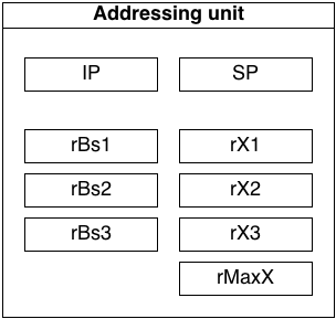 За да извършим дадено пресмятане трябва да заредим 2-та изходни регистъра. Да се пресметне резултата от АЛУ и да запишем резултата обратно в паметта. За да извършим всичко това ни трябва нещо с което да ходим върху паметта за да четем и пишем. Трябва ни модул за адресни изчисления, с който да определяме адрес от паметта в който ще четем или пишем. Имаме 3 потока данни. Два за да заредим изходните регистри и един за да запишем резултата обратно в паметта. Следователно ни трябват 3 индексни регистъра които ще сочат към съответните места в паметта, където ще бъдат четени или записвани данни. Най-често използваната структура данни е масивът, паметта е линейна структура и това е логично. Мястото на елемент от масива се определя чрез началото на масива и отместването в него. Следователно за един поток данни ни е нужно един базов регистър, който ще сочи началото на масива и един индексен, който ще сочи отместването в масива. Това са 3 базови и 3 индексни регистъра. Да възможно е без базов регистър, като индексният се зареди с началото на масива и после се добави отместването, но при този случай губим стойността на началото на масива. Тя би била нужна и в следващо изчисление, а и се лишаваме от някои фокуси, за които ще стане въпрос по-нататък. Трябва ни и още 1 регистър, който ще съдържа краят на масива, с него ще сравняваме индексния регистър и ще проверяваме за край на масив. Фиг. 2 Програмно достъпни регистри в адресният модул.