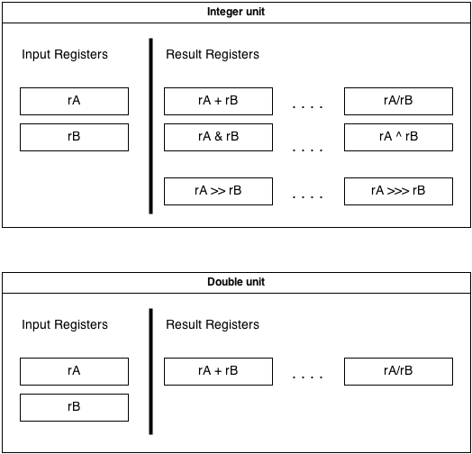 ИнтроОсновната задача на CPU е да извършва аритметически и логически операции. Всички аритметически и логически операции имат 2 изходни операнда и един резултат. Представете си процесор който има 2 регистъра в които ще поставяме изходните данни, АЛУ и толкова регистри за резултат колкото са всички възможни операции, които неговото АЛУ може да извършва. След въвеждане на данните в регистрите АЛУ изчислява паралелно всички възможни операции между изходните данни и ги поставя в съответният регистър. Името на регистъра е името на операцията чийто резултат съдържа. Например регистър AplsB съдържа резултатът от сумата на двата изходни регистъра. На такъв тип процесор му е нужна една единствена инструкция. Това е инструкцията премести – move. Преместване на данните в посока памет регистър, за зареждане на изходните регистри. Както и move&start премества данните памет регистър и започва изчисления. Преместване на данните регистър с резултат обратно в паметта. Възможна е разбира се и преместване на данните от някой от изходните регистри обратно в паметта, операция копиране. Всичко до тук изглежда доста простичко. Една програма на практика ще е пътят на данните. Има един недостатък, това е доста по-големият разход на енергия за изчисляване на резултати, които всъщност не ни трябват. Но всъщност е просто въпрос на интерпретация дали AplsB е код на изчисление или регистър. Процесорите работят с цели числа и с числа с плаваща запетая. Затова са необходими 2 модула с подобна структура. Единият ще работи с цели числа, а другият с числа с плаваща запетая. Модулът с плаваща запетая не извършва логически операции, поради формата на числата. Блок схемата е показана на фиг. 1. Фиг. 1 Блок схема на целочислен модул и ма модул за работа с числа с плаваща запетая.